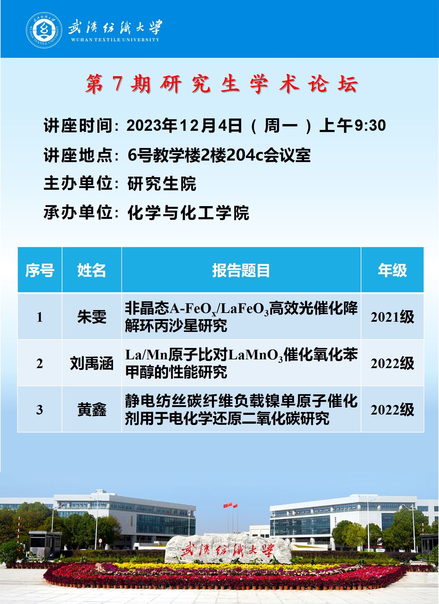 学术预告:第452期研究生学术论坛暨化学与化工学院2023年第6期研究生学术论坛